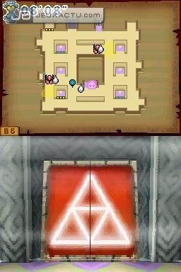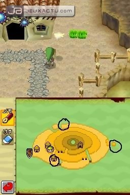L’écran du haut quand à lui sert à afficher la carte, que vous pouvez à tout moment faire glisser sur l’écran du bas pour y annoter des informations, comme l’ordre dans lequel il faut activer les interrupteurs par exemple ou un itinéraire précis à emprunter. Plutôt habile ma foi. Mieux, face à certains boss, l’utilisation du double-écran se révèle être ingénieuse, notamment face à ce monstre invisible que Link peut néanmoins repérer grâce à l’écran supérieur, représentant le regard du Boss. Il ne tient plus qu’à nous de repérer sa position pour lui asséner des coups fatals. Vous l’aurez compris, mis à part le fait que notre main peut parfois gêner la visibilité de l’écran, la maniabilité au stylet est tout simplement excellente. Cette jouabilité tactile n’en reste pas moins dispensable. Etant donné le faible nombre de fonctions tactiles vraiment utiles, on aurait très bien pu s’accommoder d’un jonglage entre le stylet et les touches. Tant pis, ici le choix nous est imposé.