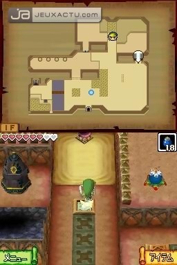 L’écran du haut quand à lui sert à afficher la carte, que vous pouvez à tout moment faire glisser sur l’écran du bas pour y annoter des informations, comme l’ordre dans lequel il faut activer les interrupteurs par exemple ou un itinéraire précis à emprunter. Plutôt habile ma foi. Mieux, face à certains boss, l’utilisation du double-écran se révèle être ingénieuse, notamment face à ce monstre invisible que Link peut néanmoins repérer grâce à l’écran supérieur, représentant le regard du Boss. Il ne tient plus qu’à nous de repérer sa position pour lui asséner des coups fatals. Vous l’aurez compris, mis à part le fait que notre main peut parfois gêner la visibilité de l’écran, la maniabilité au stylet est tout simplement excellente. Cette jouabilité tactile n’en reste pas moins dispensable. Etant donné le faible nombre de fonctions tactiles vraiment utiles, on aurait très bien pu s’accommoder d’un jonglage entre le stylet et les touches. Tant pis, ici le choix nous est imposé.