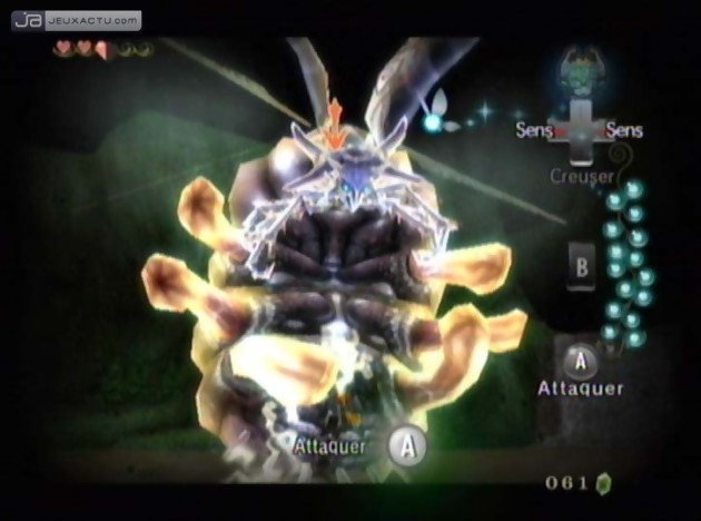 Passé ces moments de désagrément, il faut bien admettre que diriger Link à l’aide des deux modules de la manette Wii est un plaisir nouveau. Nouveau ? Pas tout à fait puisque notre héros répond immédiatement au doigt et à l’œil et les déplacements de Link paraissent tout simplement évidents et naturels. Pas besoin de temps d’adaptation pour ceux ou celles qui ont d’ores et déjà ingurgité les précédentes aventures de Link. Certes, l’absence de second stick analogique nous empêche d’avoir un contrôle total de la caméra, mais le bouton Z bien placé sur le Nunchuk permet de recentrer l’angle de vue dans le dos de notre héros. Pratique oui mais parfois capricieux dans les lieux plus étriqués, où les phases de plate-forme demande concentration et dextérité, malgré un saut automatique. Mais lorsqu’il s’agit de locker un adversaire, le plus proche bien évidemment, le Z-target remplit son job comme il se doit et le combat à l’épée peut enfin commencer. Et pour faire d’une pierre deux coups, Nintendo place aussitôt Link dans une position de défense via son bouclier au moment d’un affrontement. Astucieux. D’un simple coup de poignée avec la Wiimote, Link dégaine son épée de son fourreau, placé dans son dos. La multiplicité des attaques, aussi bien à l’aide de la Wiimote et du Nunchuk se fait dans la progression. Certes, les mouvements de base s’appréhendent dès le départ de l’aventure mais au fur et à mesure de notre avancée dans le monde du Crépuscule, Link sera sujet à de nouveaux apprentissages, tels que le coup de grâce, cette attaque particulièrement violente et dévastatrice qui a permis d’ailleurs au Link de The Legend of Zelda : The Wind Waker d’achever Ganondorf dans son ultime combat. Il y a six bottes secrètes à débloquer et qui permettent à Link d’être paré contre son ultime combat face, non pas à Puppet Zelda mais à Ganondorf, chevalier émérite certes mais qui succombera face à la Master Sword de notre héros.