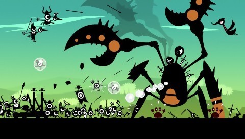 Planqué sur le côté ouest du stand de Sony Computer Entertainment sur à peine 5 m², Patapon n’est pas le genre de jeu sur lequel l’éditeur japonais a voulu miser ses plus grosses billes. Il suffisait pourtant de voir la longue file d’attente pendant ces trois premiers jours du salon pour comprendre que la firme s’était royalement plantée. Il est vrai qu’au premier coup d’œil, Patapon ne possède pas le pedigree type pour en faire un premier de la classe, un jeu AAA comme on dit dans notre jargon de vieux nerds et de geeks. Pourtant, en regardant de plus près, certains indices pouvaient nous mettre la puce à l’oreille. Graphismes minimalistes, palette de couleurs fortement réduite, et concept complètement tordu, ce sont pourtant ces détails qui font de Patapon le jeu le plus hype du moment.