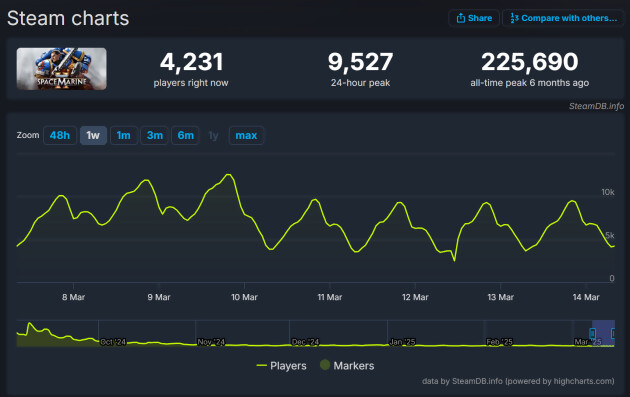 Face au succès critique comme commercial de Warhammer Space Marine 2, Focus Entertainment, Games Workshop et Saber Interactive ont décidé de remettre le couvert et nous officialisent le développement de Warhammer 40.000 Space Marine 3. Bien sûr, à ce stade, aucune date de sortie n'a été communiquée ni mêmes les plateformes, mais puisqu'on est aux prémices de la production, il va falloir être patient. En attendant, on imagine que les créatifs savent pertinemment ce que les joueurs recherchent avec cette licence, qui est devenue quelque part ce Gears of War par subsitution qu'on attendait tous. Dans tous les cas, le public a répondu présent, avec 2 millions de joueurs en 24h et un pic de 225 690 joueurs en simultané sur Steam lors de sa sortie. Le nombre de joueurs a continué à grimper jusqu'à atteindre les 6 millions en Janvier 2025. Attention tout de même, on parle de nombre de joueurs et non de ventes réelles, mais selon certaines estimations, les ventes seront aussi impressionnantes. De quoi pousser les pontes de chaque entreprise impliquée à prendre la parole.
