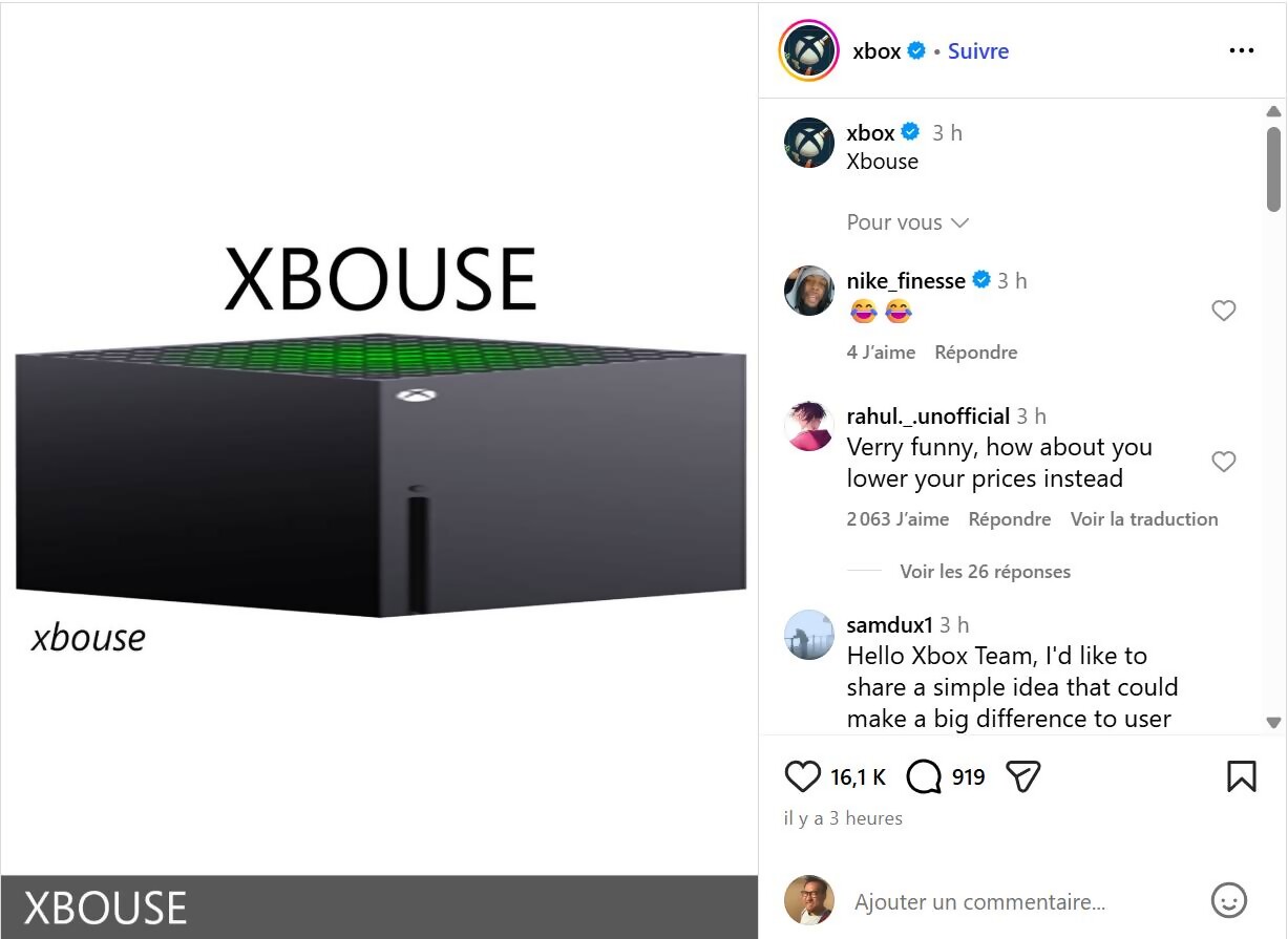 Décidément, chez Xbox, la communication, c’est un peu compliqué en ce moment. En effet, ce lundi 3 novembre 2025, le compte officiel britannique de la marque sur Twitter et le compte Xbox monde sur Instagram ont tous les deux publié une image vantant la “Xbouse”, un jeu de mots contraction entre “Xbox” “House” censé évoquer un nid douillet, mais qui en français a une toute autre signification. Et Internet ne leur a évidemment pas pardonné. L’image, répétant trois fois le mot “Xbouse”, a sans doute fait sourire les fans de la marque Xbox en parlant d’une maison aux couleurs Xbox, d'où cette console Xbox Series X coupée sur le haut pour représenter une maison. Sauf qu’à la lecture française, difficile de ne pas éclater de rire (ou de consternation). En l’espace de quelques minutes, le post devient viral, avant d’être promptement supprimé, sans explication officielle. Sauf que le mal est fait. En France, le mot “Xbouse” traîne déjà depuis des années sur les forums Internet, utilisé comme insulte par les anti-Xbox pour moquer la marque de Redmond. Autant dire que voir Microsoft reprendre involontairement le terme a provoqué un grand moment de malaise… et de memes.